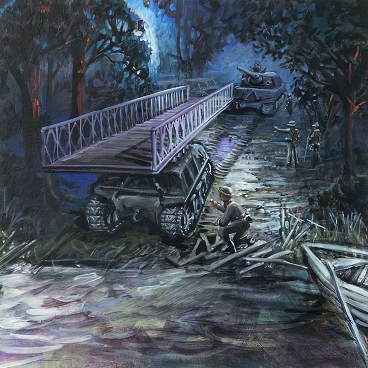 They stopped the tank at the river’s edge. Then the pusher tank slowly moved forward, deploying the bridge across the river. As the bridge began to move, Kingsmill ordered the carrier tank forward to keep it from getting bogged down in the soft ground. As planned, it plunged into the river and sank. The driver and Kingsmill escaped and swam back across the river. The radio operator scrambled hand-over-hand underneath the bridge to shore.